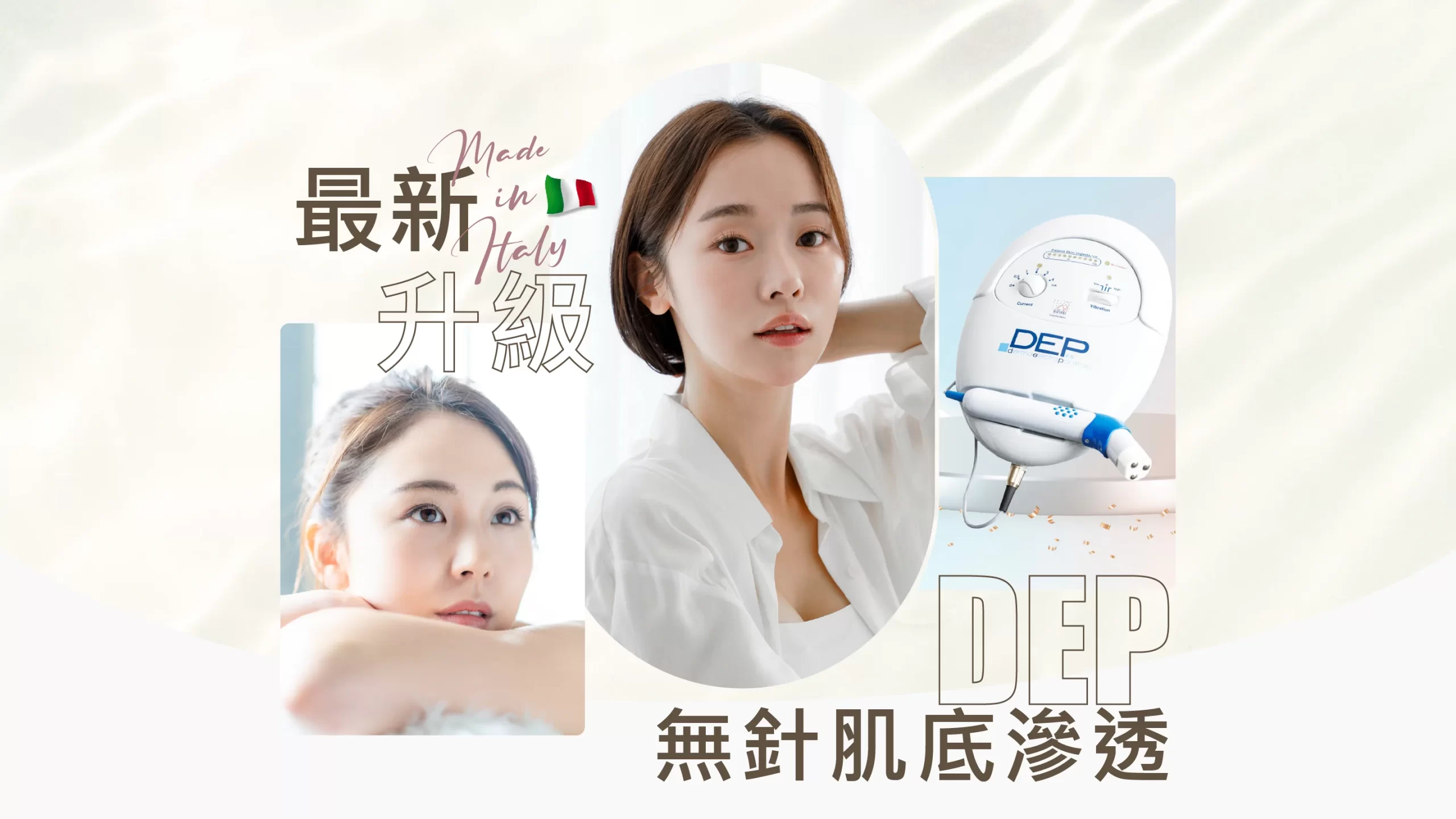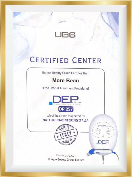 DEP (Dermoelectroporation®) 無針肌底滲透療程是一種由意大利研發及製造,國際性專利技術,並獲得美國FDA認證、CE認證、ISO9001及ISO13485醫療器材品質管理系統標準、並符合GMP標準的醫學美容技術。
